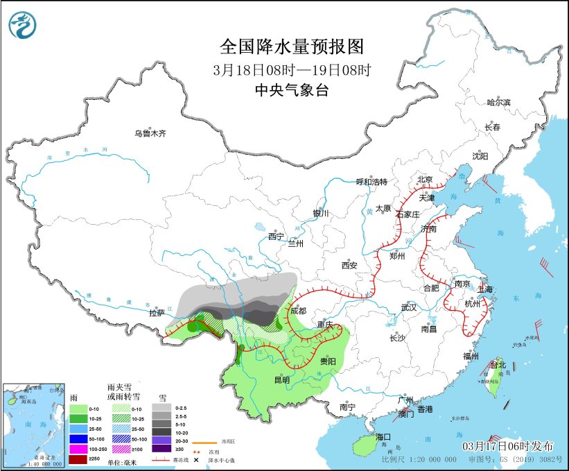 3月18日08时至19日08时,西藏东部、川西高原等地部分地区有小到中雪或雨夹雪,局地有大到暴雪。四川盆地南部、贵州大部、云南、海南岛、台湾岛等地部分地区有小雨,其中,西藏东南部、云南西北部等地部分地区有中雨。