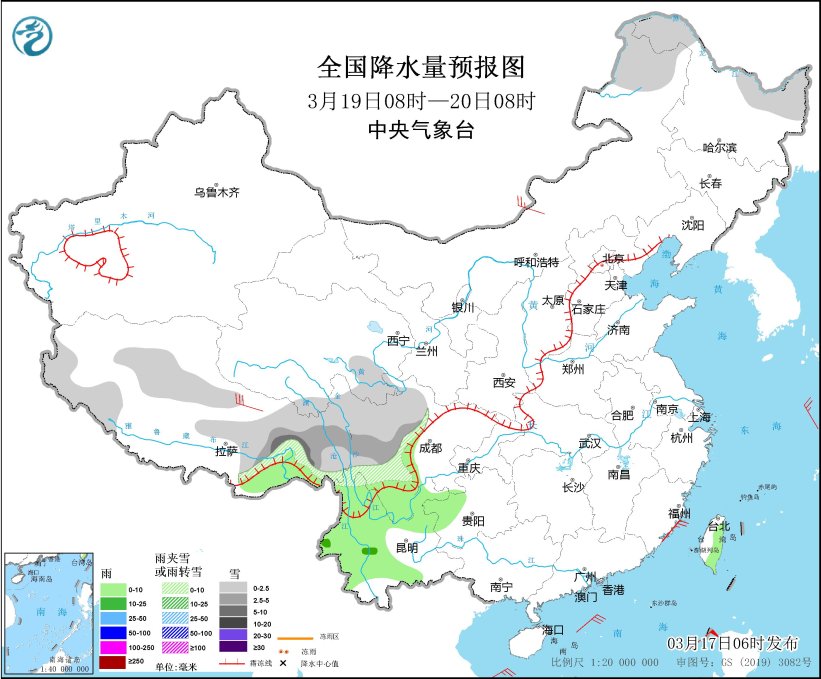 3月19日08时至20日08时,内蒙古东北部、西藏东部、川西高原等地部分地区有小到中雪或雨夹雪。西藏东南部、西南地区南部等地部分地区有小雨,局地有中雨。内蒙古中部等地部分地区有4~6级风。