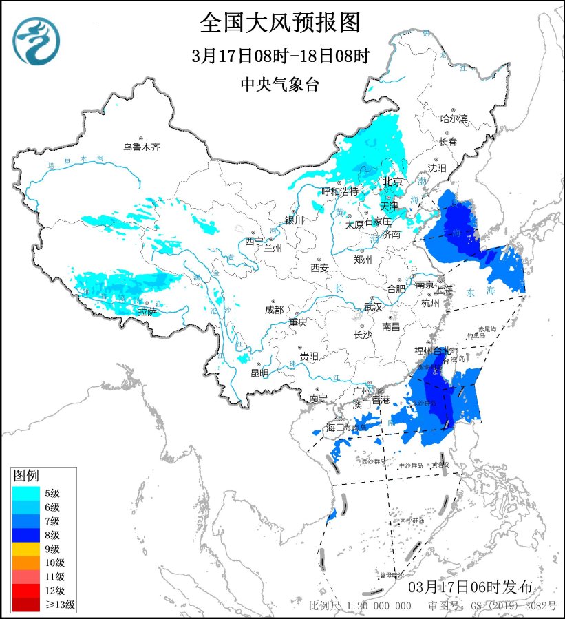 预计,3月17日08时至18日08时,西藏中部、青海西部、内蒙古中部、华北北部和东部、山东半岛、台湾岛等地有5~6级风,局地风力可达7级及以上;黄海大部海域、东海北部海域、台湾海峡、巴士海峡、南海东北部海域将有7~8级、阵风9级的大风,中央气象台3月17日06时继续发布大风蓝色预警。