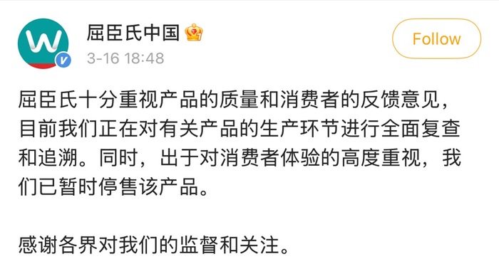 @屈臣氏中国 3月16日发文称,屈臣氏十分重视产品的质量和消费者的反馈意见,目前正在对有关产品的生产环节进行全面复查和追溯。同时,出于对消费者体验的高度重视,已暂时停售该产品。感谢各界的监督和关注。