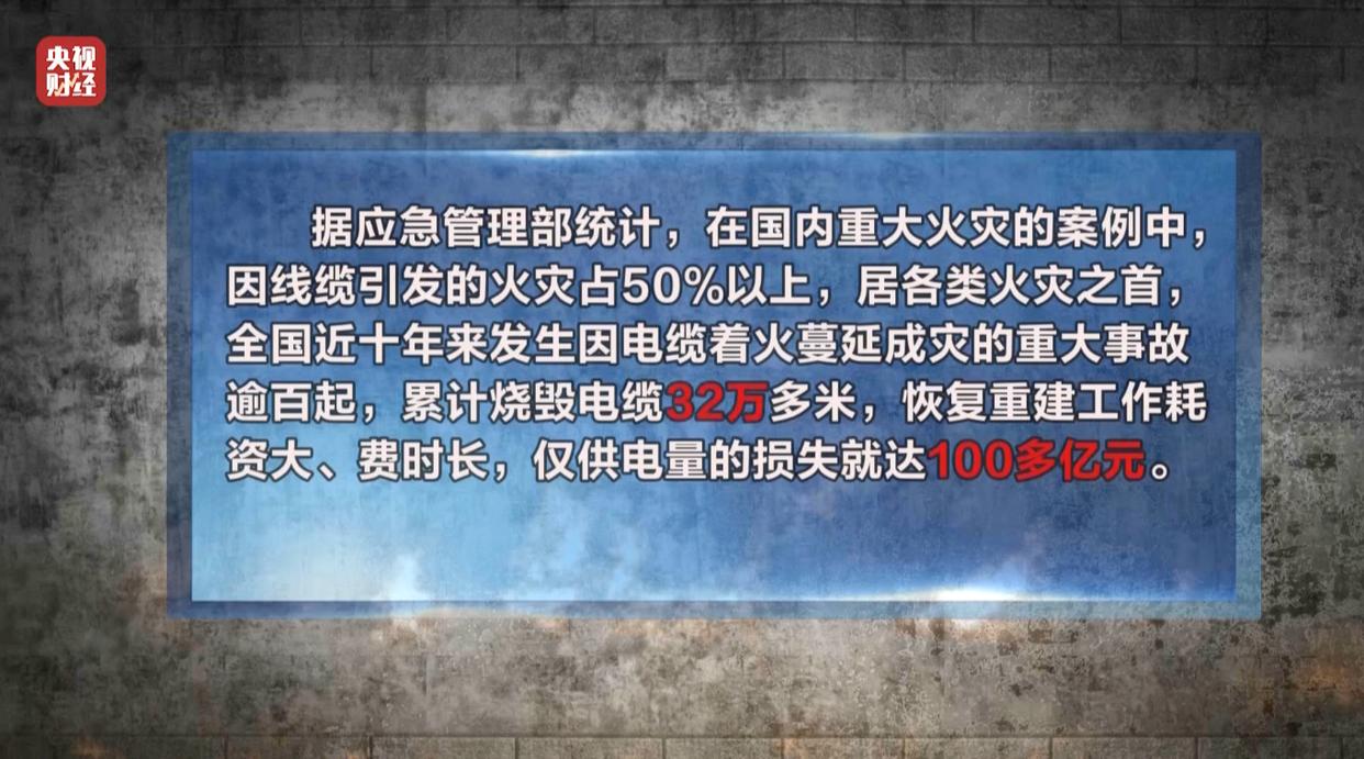 据应急管理部统计,在国内重大火灾的案例中,因线缆引发的火灾占50%以上,居各类火灾之首,全国近十年来发生因电缆着火蔓延成灾的重大事故逾百起,累计烧毁电缆32万多米,恢复重建工作耗资大、费时长,仅供电量的损失就达100多亿元。