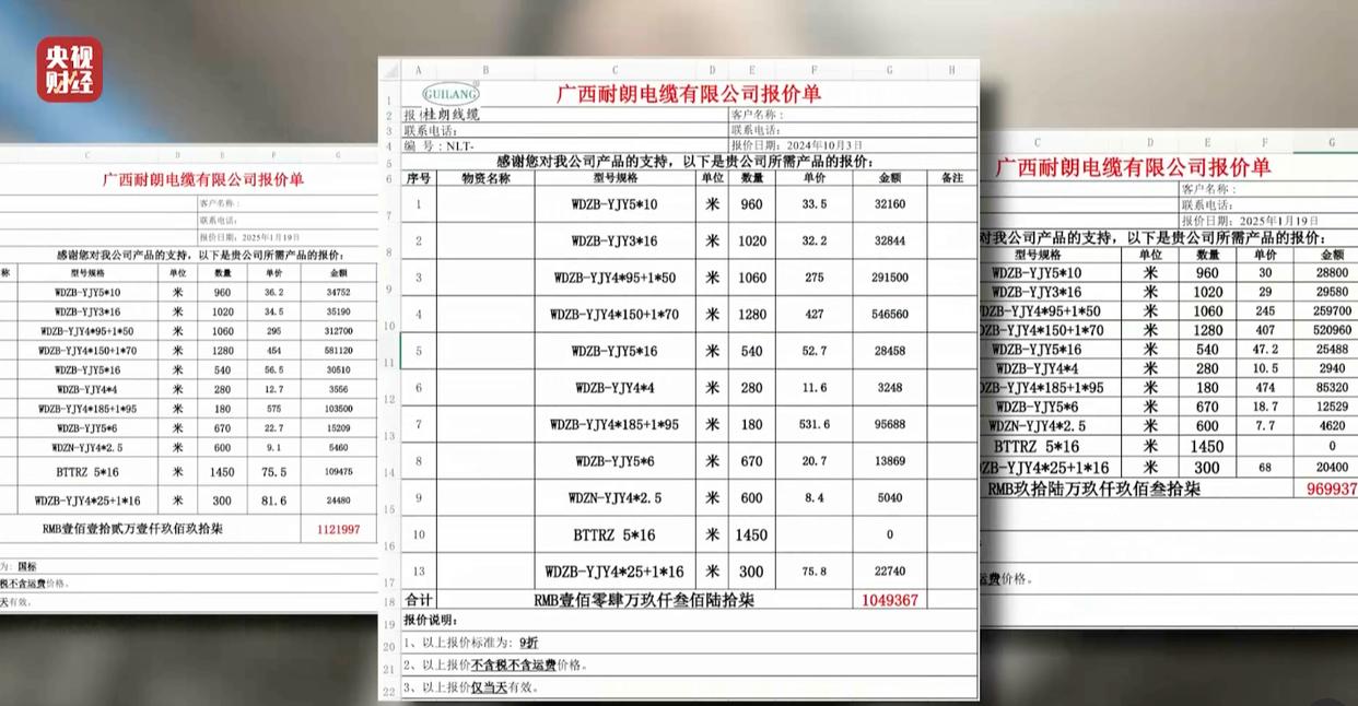 为了招揽生意,范经理私下拿出了一张内部的报价单。这张耐朗电缆有限公司的报价单上显示,报价竟然被细分为国标、9折和8折报价。国标的报价为1121997元,8折的为969937元,仅一单就相差十五多万元。