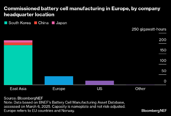 (注: 数据基于2025年3月6日获取的彭博新能源财经电池制造资产数据库。产能为铭牌数据,未经风险调整。欧洲指欧盟国家和挪威。)