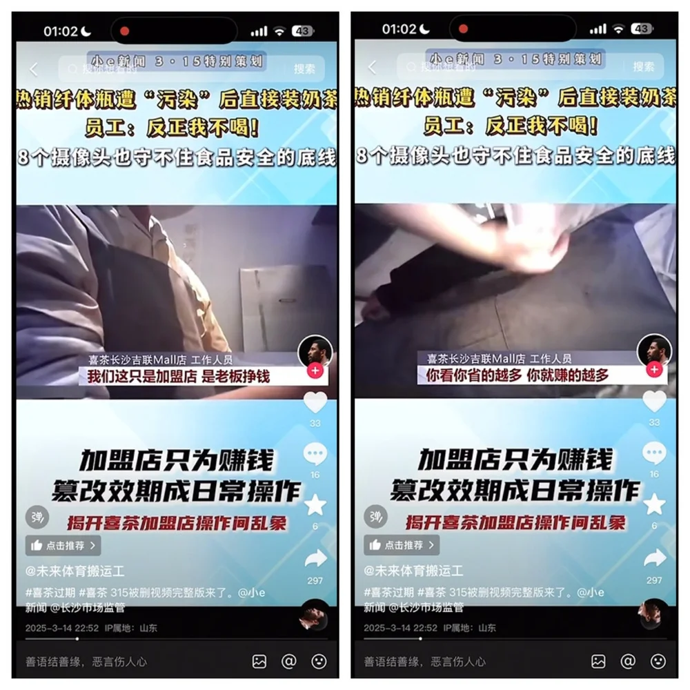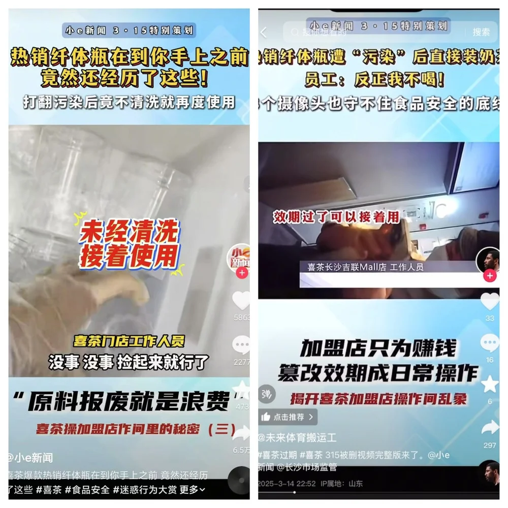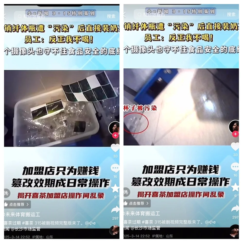 3月15日消息,据湖南经视《大调查》栏目报道,暗访记者卧底喜茶长沙某加盟店后厨,发现店员人为篡改原料标签,纤体瓶未经清洗就直接使用等。