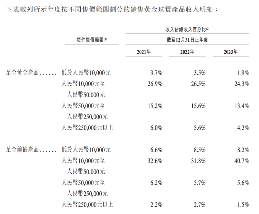 值得关注的是,老铺黄金有相当一部分比重的足金镶嵌产品,这类镶嵌产品毛利率也较高。老铺黄金招股书介绍,该企业的足金镶嵌产品占比达到45.8%,在2023年总营收中占比为56%。