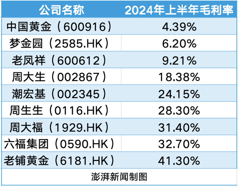 澎湃新闻记者对比了九家黄金上市公司2024年上半年毛利率,老铺毛利率高达41.3%,周大福和六福集团毛利率为三成,中国黄金仅超4%。