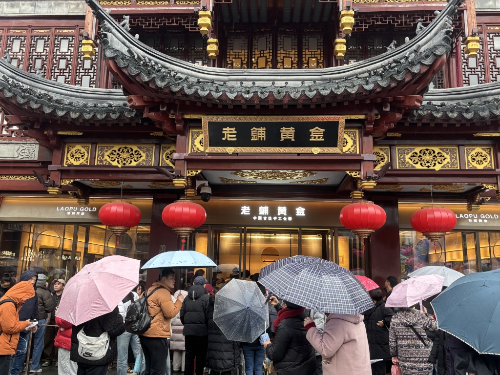 相较于其他金店,豫园店面积并不大,但门庭若市。澎湃新闻记者曾两次到访老铺黄金门店,因排队过长,也衍生出了黄牛这一角色,付50元,可从黄牛手中换取更靠前的号码。