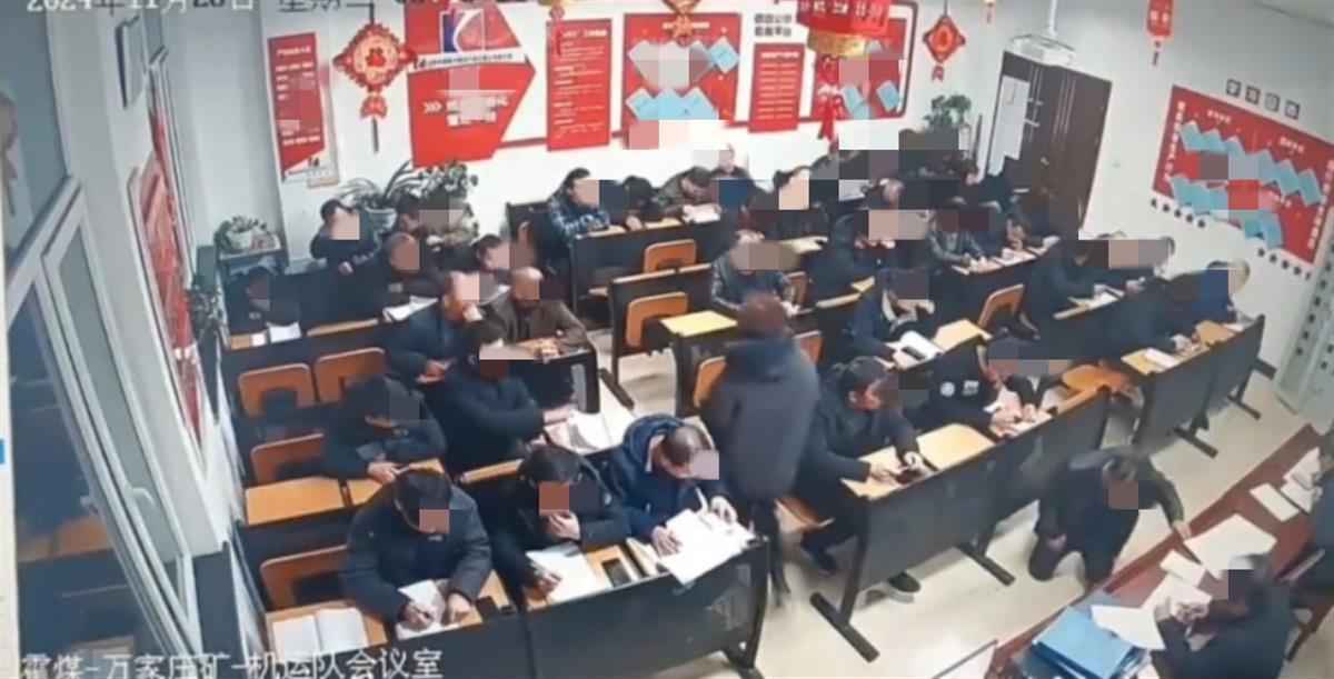视频显示,监控时间为2024年11月26日,地点在万家庄煤矿机运队会议室。视频中,一名男子走进会议室单膝跪地,朝主席台低头作揖后又转身向第一排做出同样动作,随后离开会议室。