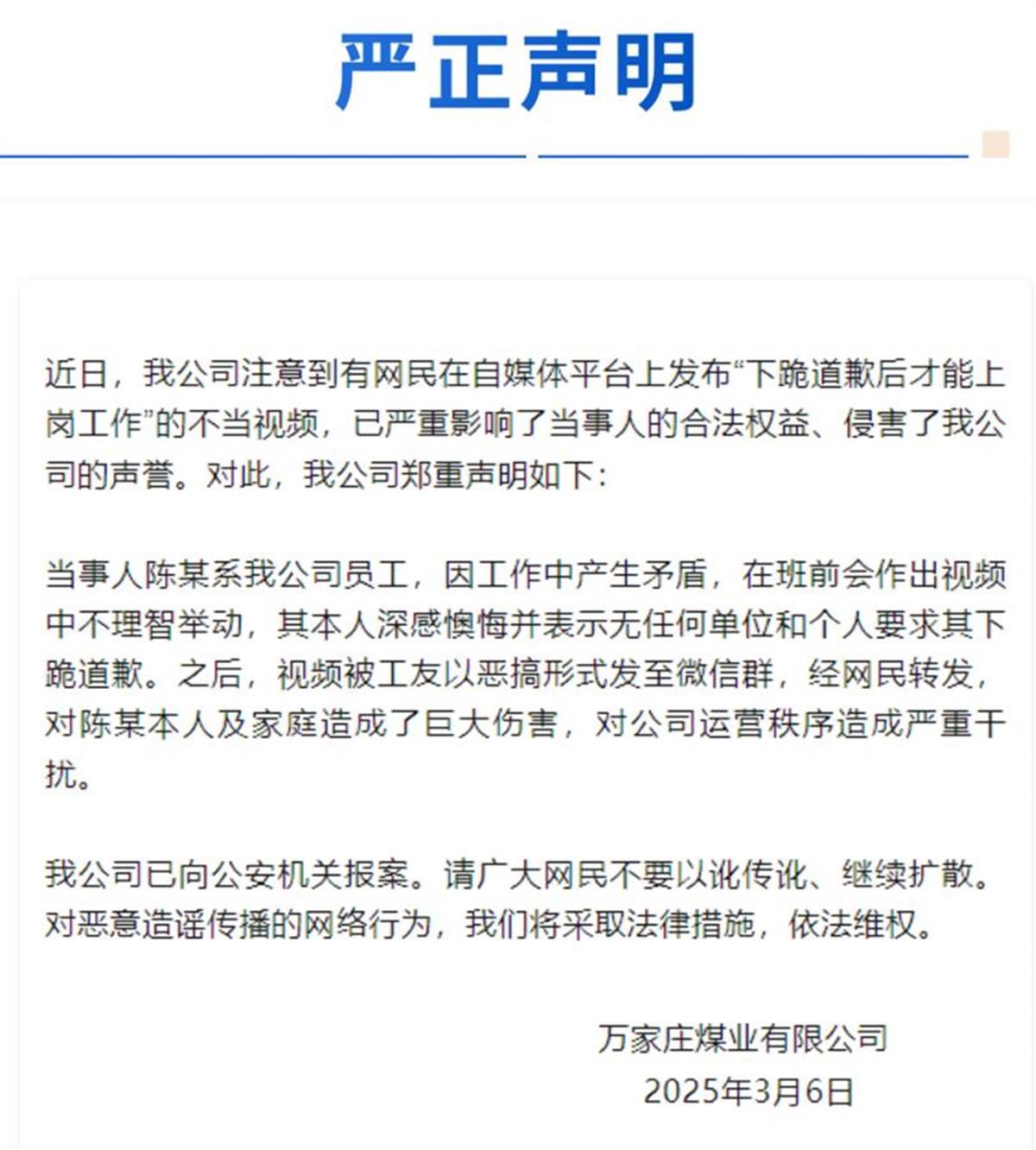 极目新闻记者注意到,3月7日凌晨,“山西焦煤霍州煤电万家庄煤业”官微发布声明:近日,该公司注意��有网民在自媒体平台上发布“下跪道歉后才能上岗工作”的不当视频,已严重影响了当事人的合法权益、侵害了该公司的声誉。当事人陈某系该公司员工,因工作中产生矛盾,在班前会作出视频中不理智的举动,其本人深感懊悔并表示无任何单位和个人要求其下跪道歉。之后,视频被工友以恶搞形式发至微信群,经网民转发对陈某本人及家庭造成了巨大伤害,对公司运营秩序造成严重干扰。该公司已向公安机关报案。