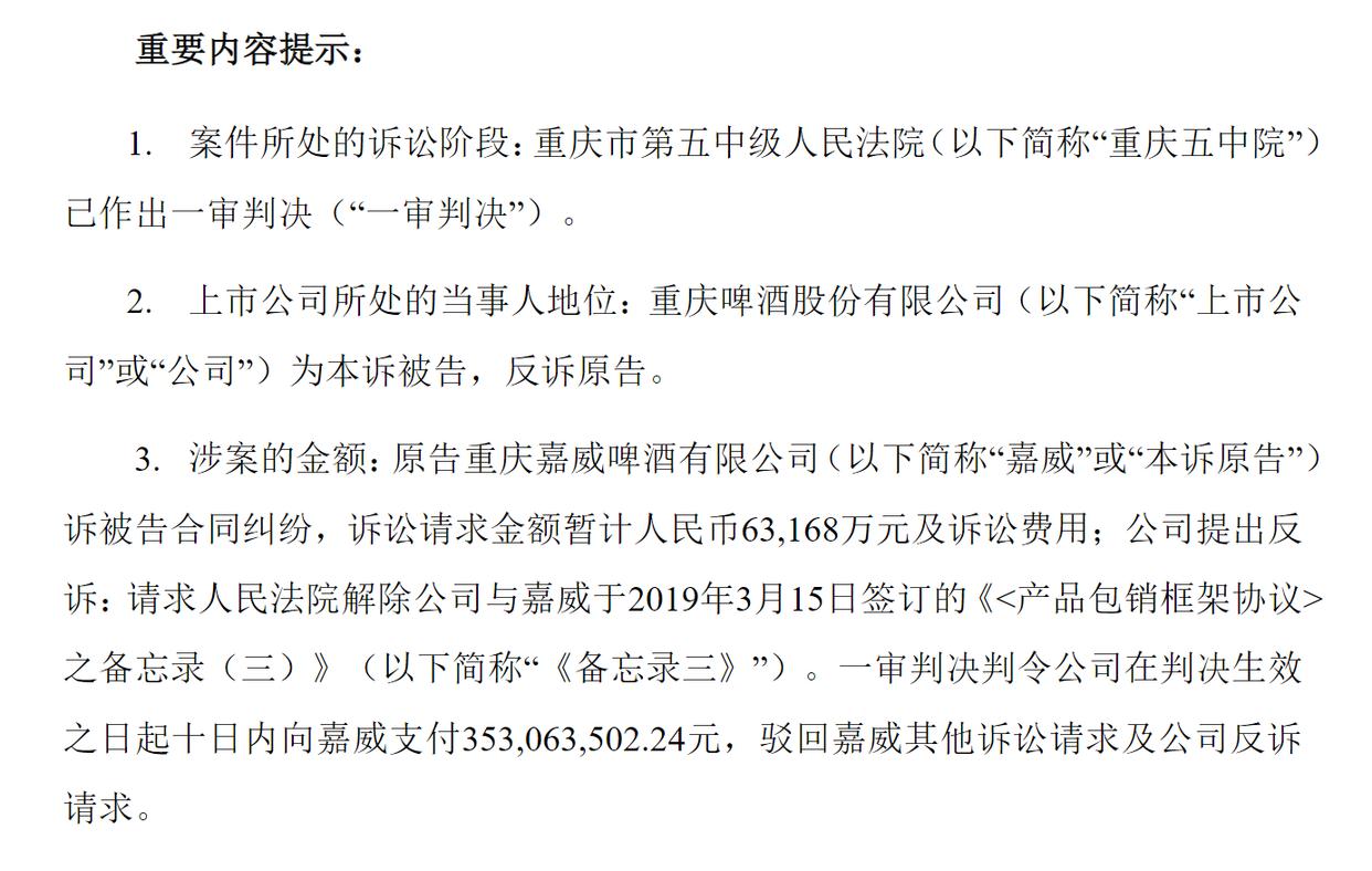 重庆啤酒公告称,就嘉威啤酒诉公司的合同纠纷以及公司的反诉请求,重庆市第五中级人民法院已作出一审判决。一审判决判令公司在判决生效之日起十日内向嘉威支付约3.531亿元,驳回嘉威其他诉讼请求及公司反诉请求。
