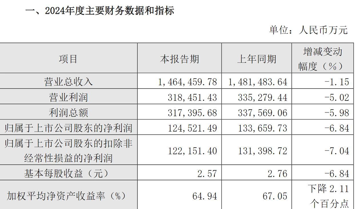 据重庆啤酒2024年业绩快报,2024年公司营业收入146.45亿元,同比下降1.15%;归属于上市公司股东的净利润约为12.45亿元,同比下滑6.84%。