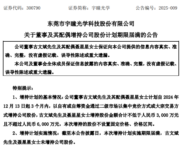 3月13日晚间,宇瞳光学公告称,公司董事古文斌先生及其配偶聂星星女士计划自2024年12月13日起3个月内,以自有或自筹资金通过二级市场以集中竞价方式或大宗交易方式增持公司股份,古文斌先生及聂星星女士增持股份金额合计不低于人民币3,000万元且不超过人民币6,000万元,本次增持的股份不设置固定价格、价格区间。截至本公告披露日,本次增持计划实施期限届满,因公司股价波动较大及个人资金安排等原因,古文斌先生及聂星星女士未增持公司股份,本次增持计划未完成。