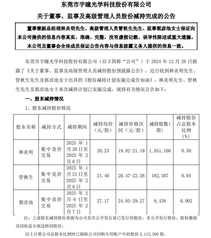 2月11日,宇瞳光学发布公告称,董事林炎明减持185万股,占公司总股本的0.5%;高级管理人员管秋生减持16万股,占总股本的0.04%;监事郭彦池减持8438股,占总股本的0.002%。