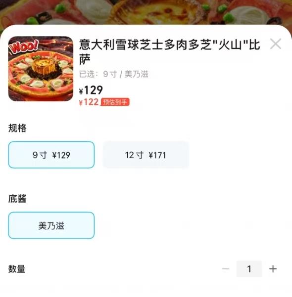 店里卖50.4元的雪球芝士多肉多芝比萨实付122元。受访者供图