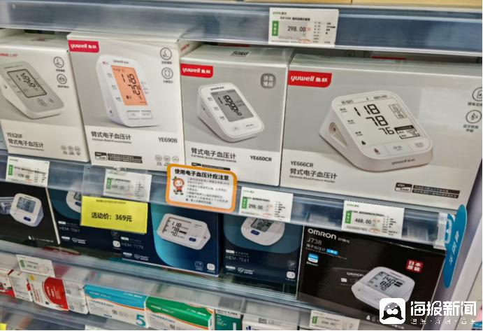 济南一家药店货架上摆放的血压计价格从158元到598元不等。