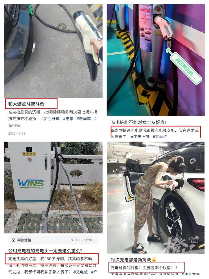 在各大社交媒体上,关于充电桩的讨论也一直很多,很多电动车女用户均反馈,充电枪太重,自己有点拿不动。更有网友晒出照片,自己曾经就被充电枪“误伤”过。