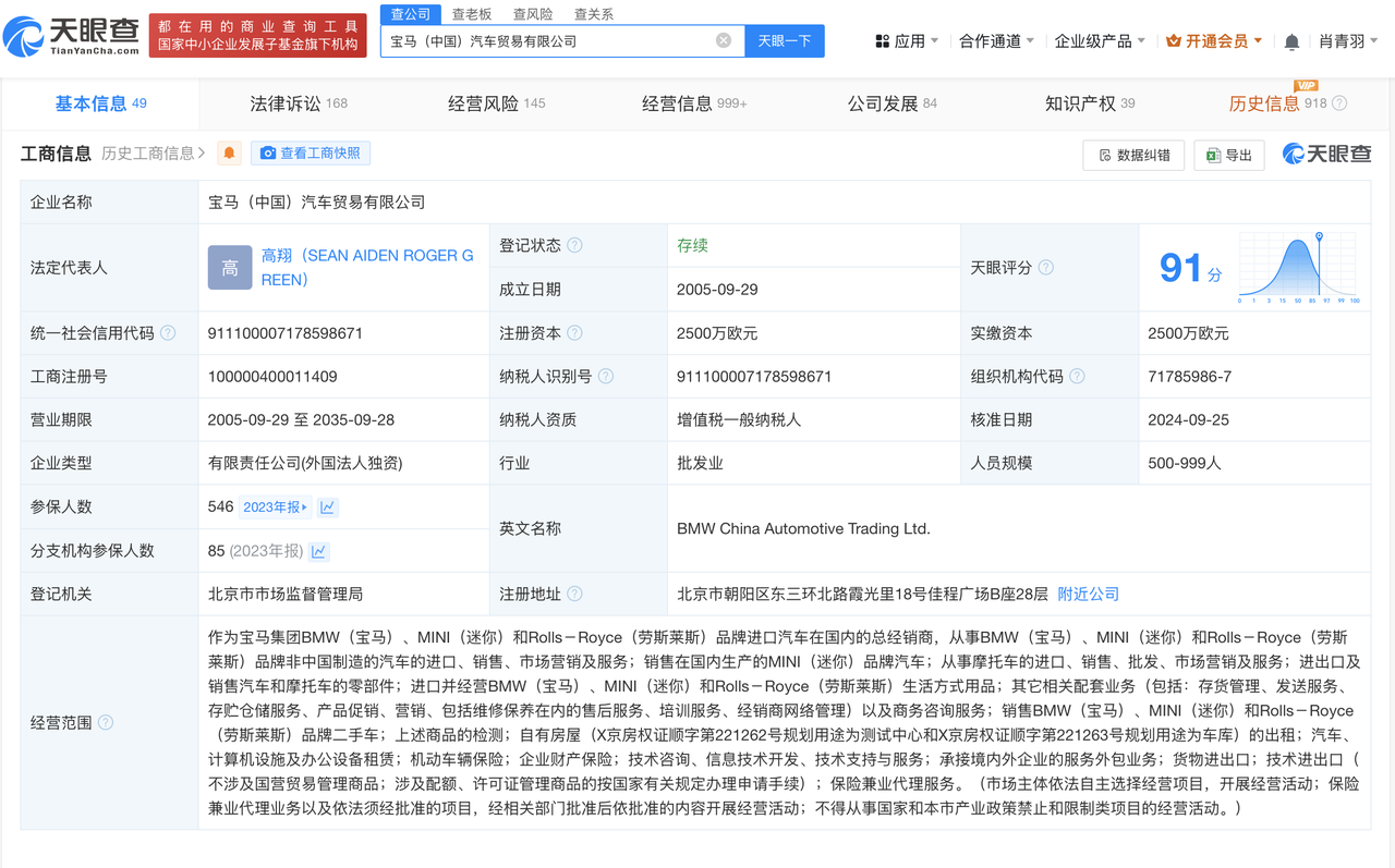 天眼查App显示,被曝光的宝马(中国)汽车贸易有限公司成立于2005年9月,法定代表人为高翔(SEAN AIDEN ROGER GREEN),注册资本2500万欧元,经营范围包括作为宝马集团BMW(宝马)、MINI(迷你)和Rolls-Royce(劳斯莱斯)品牌进口汽车在国内的总经销商,从事BMW(宝马)、MINI(迷你)和Rolls-Royce(劳斯莱斯)品牌非中国制造的汽车的进口、销售、市场营销及服务等。股东信息显示,该公司由宝马(中国)投资有限公司全资持股。法律诉讼信息显示,2024年至今,该公司曾多次因买卖合同纠纷被起诉。此外,该公司还存在多条产品召回信息,涉及部分国产及进口宝马汽车等。