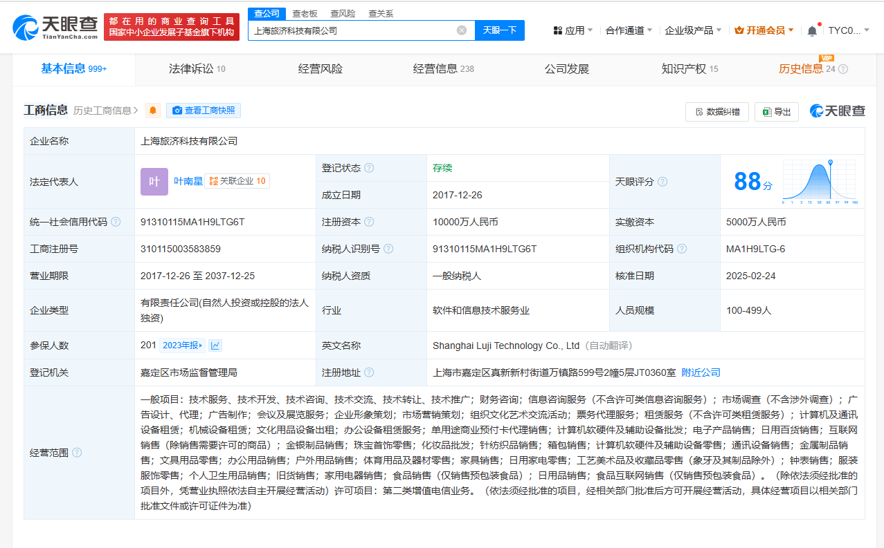 天眼查App显示,同程金融关联公司上海旅济科技有限公司成立于2017年12月,法定代表人为叶南星,注册资本1亿人民币,经营范围包括财务咨询、信息咨询服务、市场调查、广告设计、代理、广告制作、会议及展览服务等,由广州旅金科技集团有限公司全资持股。法律诉讼信息显示,2024年至今,该公司曾多次因服务合同纠纷被起诉。