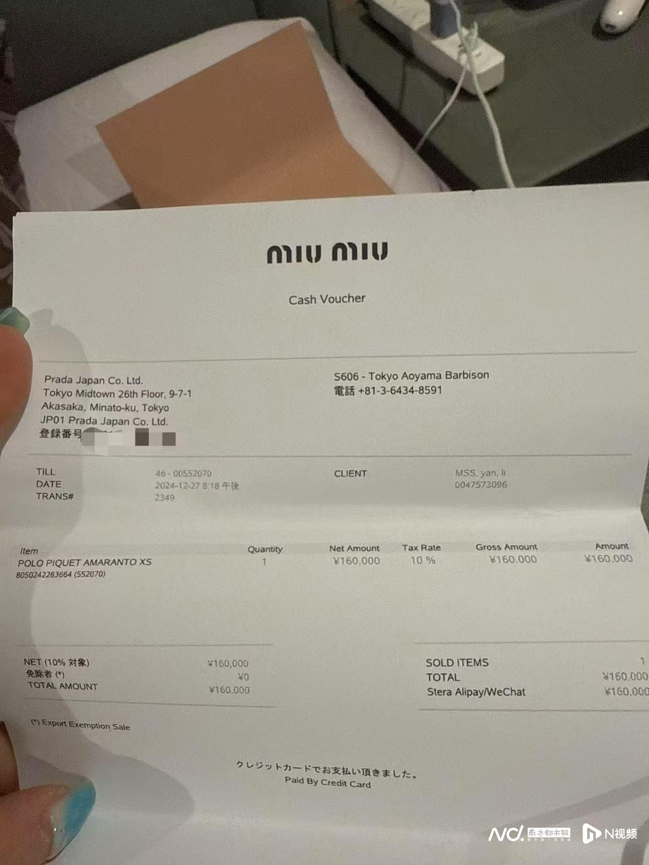 李女士提供的单据显示,该件Miu Miu上衣购于2024年12月27日,售价为人民币7404.25元,回到北京后,她将这件当时仅穿了四个小时的新衣随同其他衣服一起送洗。