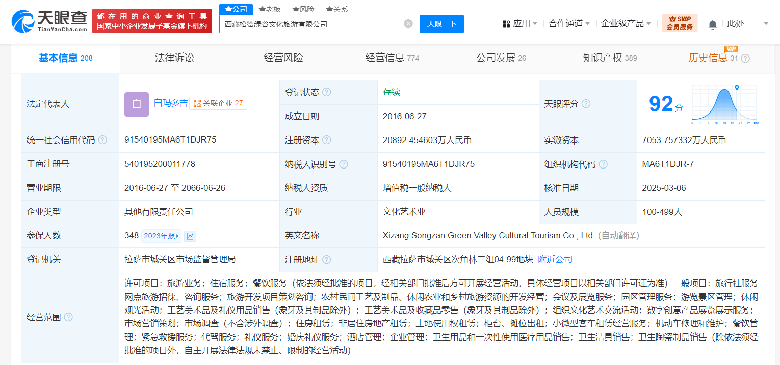西藏松赞绿谷文化旅游有限公司成立于2016年6月,法定代表人为白玛多吉,经营范围含旅游业务、住宿服务、餐饮服务、旅行社服务网点旅游招徕、咨询服务、旅游开发项目策划咨询等。股东信息显示,该公司现由白玛多吉、招银国际旗下深圳市招银千鹰展翼股权投资合伙企业(有限合伙)、西藏彼岸酒店有限公司及上述新增股东等共同持股。