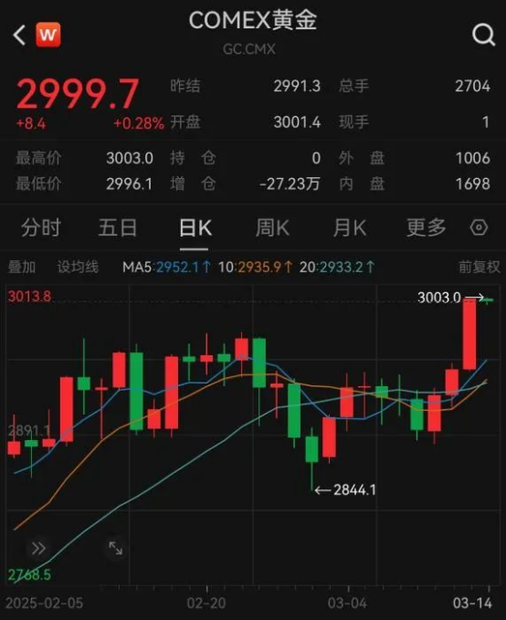 在全球关税持续动荡与美联储降息预期增强的双重催化下,金价又“狂飙”了。当地时间3月13日,COMEX黄金一日大涨超50美元,首次突破3000美元关口,再创历史新高。