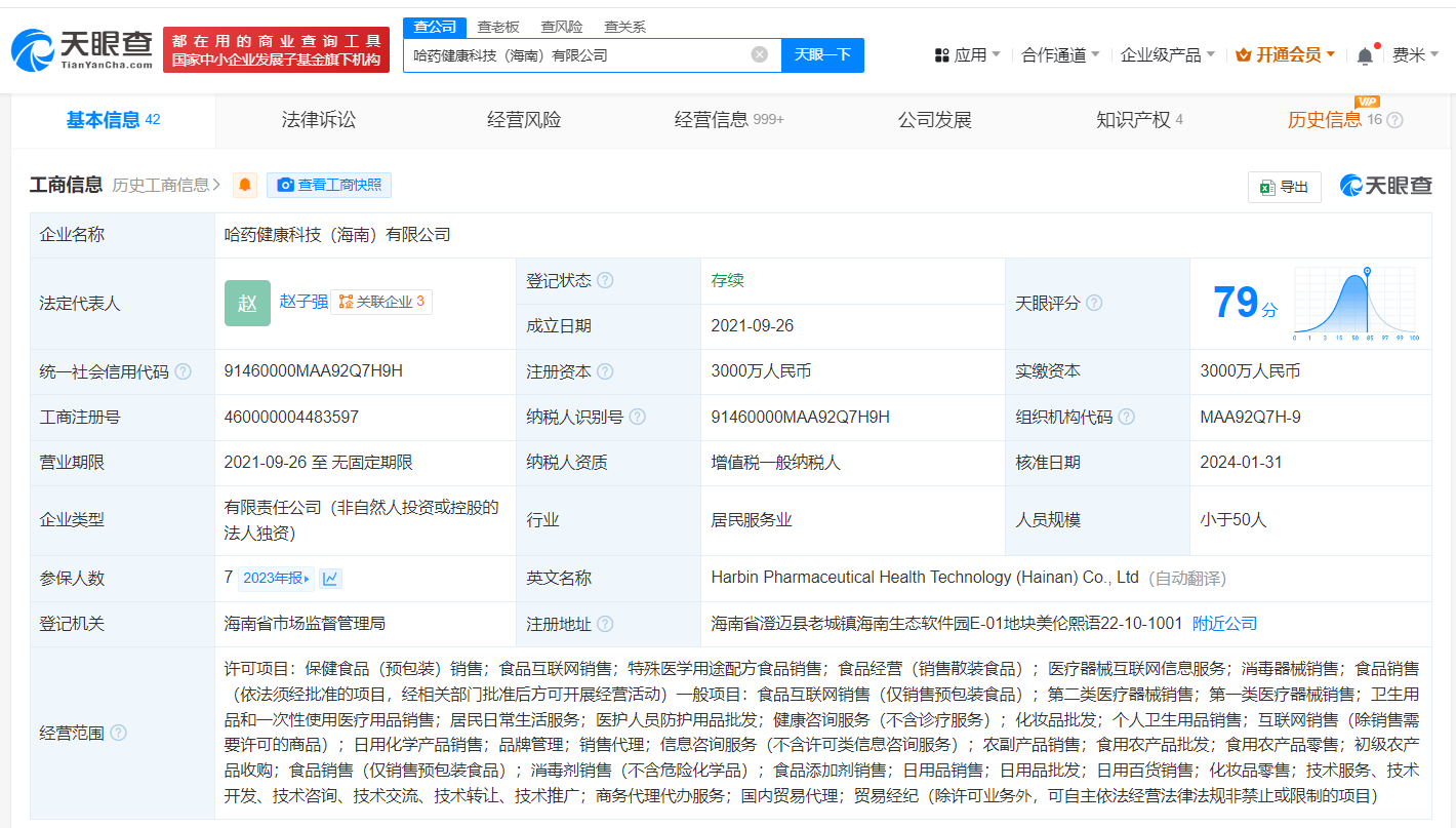天眼查App显示,哈药集团股份有限公司成立于1991年12月,法定代表人为芦传有,注册资本约25.2亿人民币,经营范围含药品生产,药品经营,食品生产,食品经营,货物或技术进出口等,由哈药集团有限公司、香港中央结算有限公司、中国证券投资者保护基金有限责任公司等共同持股。通过直接或间接持股,该公司拥有90余家企业实际控制权,包括哈药健康科技(海南)有限公司、哈药世一堂健康产业(海南)有限公司等。司法案件信息显示,该公司曾多次因买卖合同纠纷被起诉。