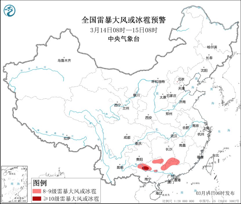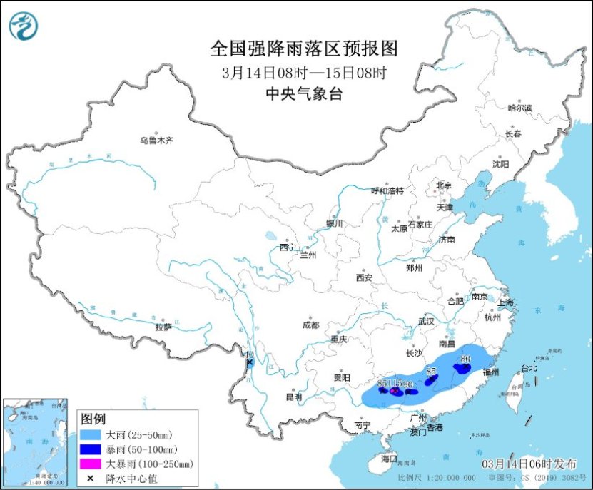 3月14日08时至15日08时,贵州东部、江南、华南中北部和江淮等地将有较强降水过程。湖南南部、江西中南部、福建西部和北部、广西东北部、广东北部以及云南西北部等地部分地区有大到暴雨,其中,湖南西南部、广西东北部等地局地有大暴雨(100~115毫米)。中央气象台3月14日06时继续发布暴雨蓝色预警。另外,广西北部、广东北部、湖南南部、江西南部等地的部分地区将有8级以上雷暴大风或冰雹天气,其中,广西北部等地的部分地区将有10级以上雷暴大风;广西中部和北部、广东北部、湖南南部、江西南部、福建西部等地的部分地区将有小时雨量大于20毫米的短时强降水天气,其中,江西南部、广西东北部、广东北部等地的部分地区小时雨量大于50毫米,最大可达60毫米以上。中央气象台3月14日6时继续发布强对流天气蓝色预警。