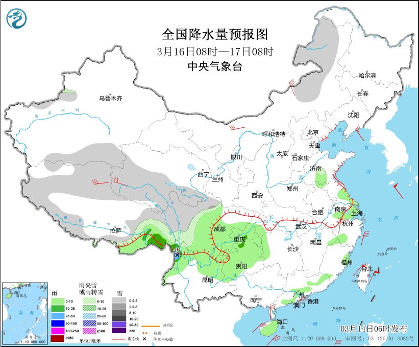 3月16日08时至17日08时,内蒙古东部、新疆西部和南疆南部、西藏北部和东部、川西高原、青海中北部等地部分地区有小到中雪或雨夹雪。西藏东南部、四川盆地大部、重庆、贵州大部、云南北部、江南东部、广东南部、海南岛等地部分地区有小到中雨,其中,云南西北部局地有大雨(25~40毫米)。内蒙古中部、西藏北部、青海西部、浙江西部、广东沿岸等地部分地区有5~6级风;渤海海峡、黄海、东海、台湾海峡、巴士海峡、台湾以东洋面、南海中北部等海域有6~7级风,阵风8~9级。