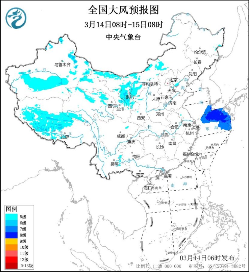 受冷空气影响,预计3月14日至15日,内蒙古中部、青海、甘肃、陕西北部以及华北北部等地有小到中雪或雨夹雪,其中,山西北部、河北北部等地局地有大雪或暴雪。14日至15日,西北地区、华北、黄淮及其以南大部地区气温先后下降4~8℃,其中,西北地区东部、华北北部、江南南部和华南中北部等地部分地区降温幅度可达10℃左右或以上。另外,预计,3月14日08时至15日08时,新疆东部和南疆盆地、西藏中北部、青海北部、甘肃北部和东部、内蒙古中西部、宁夏等地部分地区有5~6级风、阵风7~8级;黄海东南部海域、东海北部海域将有7~8级、阵风9级的大风。中央气象台3月14日06时发布大风蓝色预警。