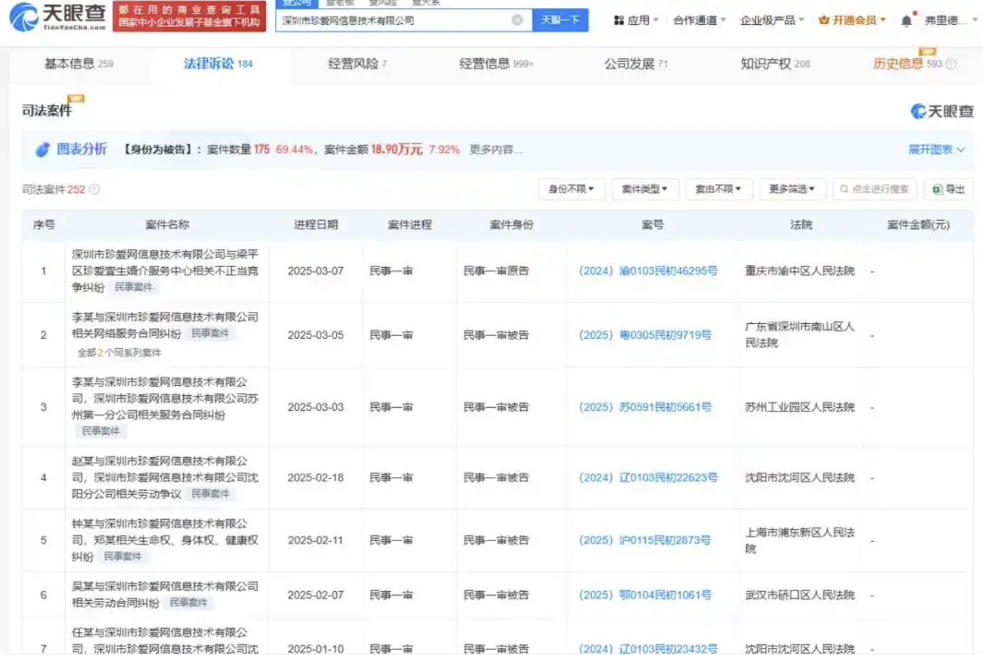 天眼查风险信息显示,深圳市珍爱网信息技术有限公司涉及多个司法案件,案件身份多为被告,案由涉及服务合同纠纷等。