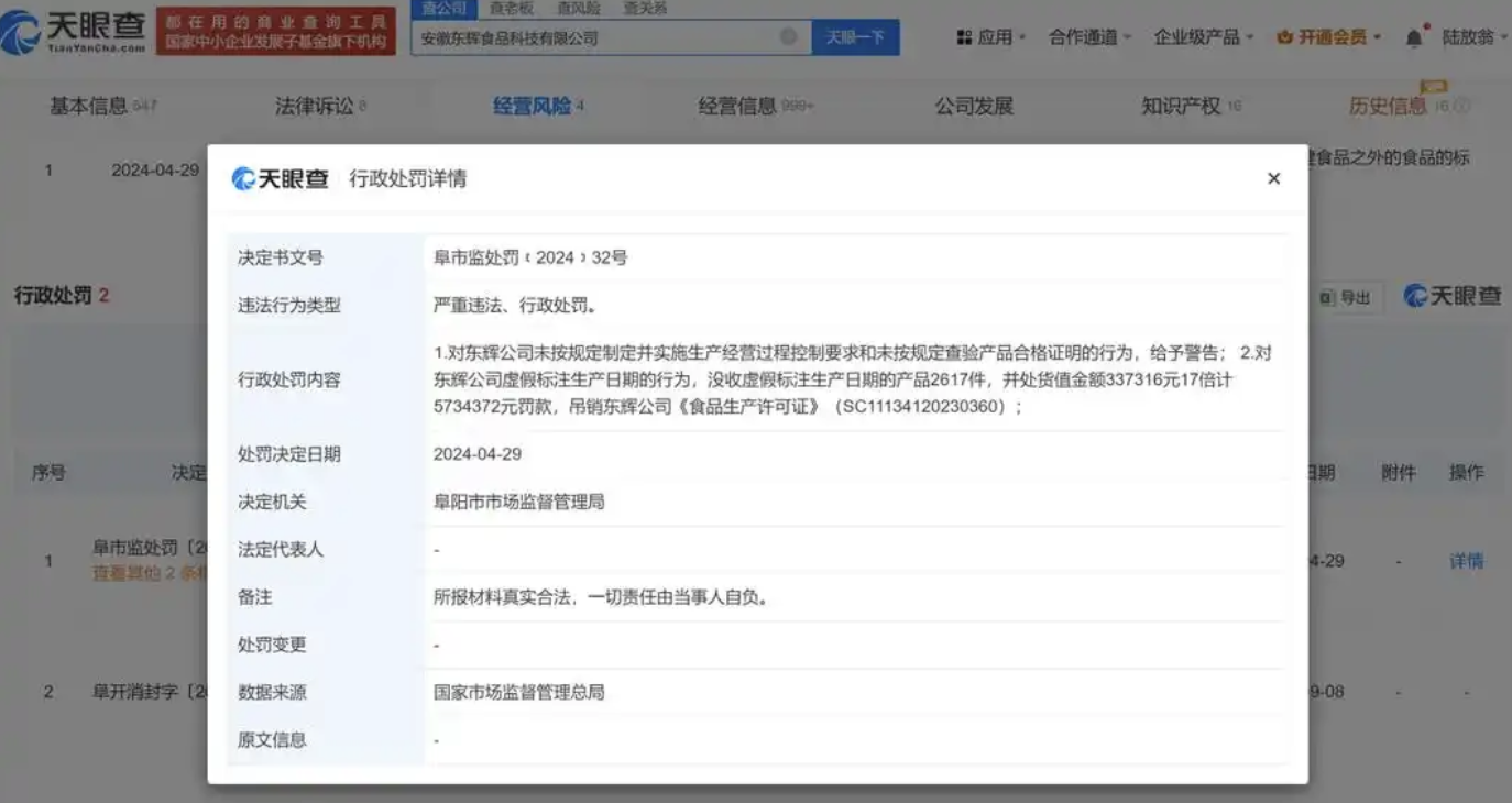天眼查行政处罚信息显示,涉足问题预制菜生产的安徽东辉食品科技有限公司在2024年4月29日,因未按规定制定并实施生产经营过程控制要求和未按规定查验产品合格证明的行为,给予警告;并因虚假标注生产日期的行为,没收虚假标注生产日期的产品2617件,同时处以金额573.4万余元的罚款,吊销东辉公司《食品生产许可证》。