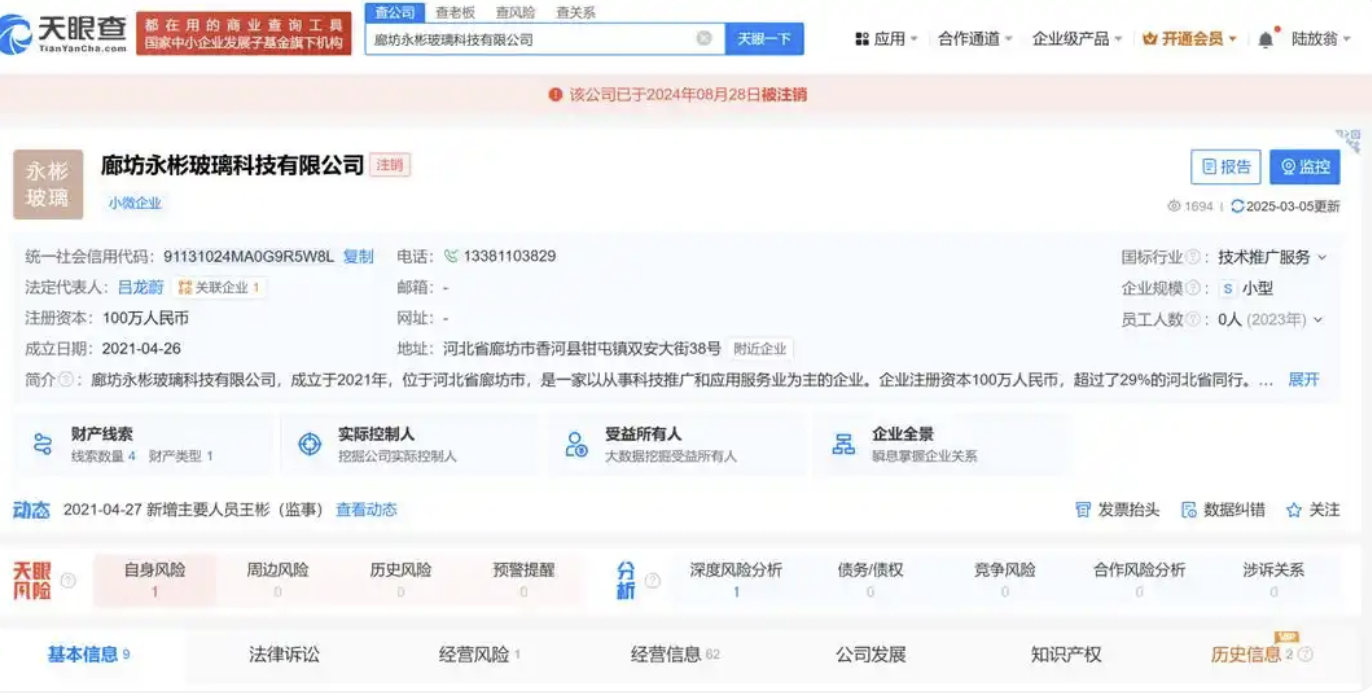 不仅如此,天眼查天眼风险信息显示,另一家涉事企业廊坊永彬玻璃科技有限公司也因制造和销售虚假防火玻璃受到处罚,已于2024年8月28日被注销。