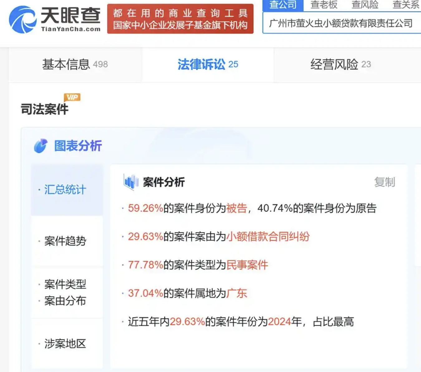 天眼查司法案件信息显示“同程金融APP”所属的广州市萤火虫小额贷款有限责任公司多年来已经是“劣迹斑斑”,近几年来涉及司法案件27件,59.26%的案件身份为被告,77.78%的案件类型为民事案件。