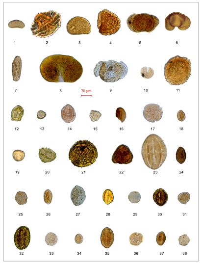 论波日山孢粉植物群包含32科40个孢粉形态,涵盖被子植物(25科)、裸子植物(3科)和蕨类植物(4科),分为三个不同的孢粉带。