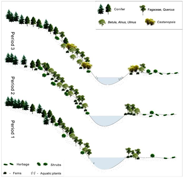 第三阶段距今1920万年至1600万年,以松和栲为主要类群的针叶—落叶阔叶混交林从高地退缩,而暗针叶林扩大。在河岸和湖泊环境中,栲树首次出现,桤木种群增加,眼子菜科在浅水区繁衍生息,麻黄和白刺在草原上大量蔓延。与第二阶段相比,第三阶段的气候更凉爽、更干燥,显著的干旱事件发生在距今1840万、1810万、1790万、1730万、1680万、1630万年。同时,桤木、眼子菜和蕨类植物的增加以及栲的出现,表明在此期间局部湿度加剧或伦坡拉古湖扩张。