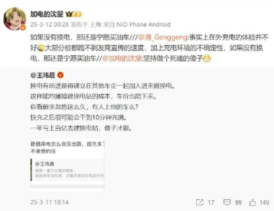 蔚来副总裁沈斐@加电的沈斐 则回应称,“坚持做个死磕的傻子”,他随后又补充道“如果没有换电,那还是宁愿买油车”。