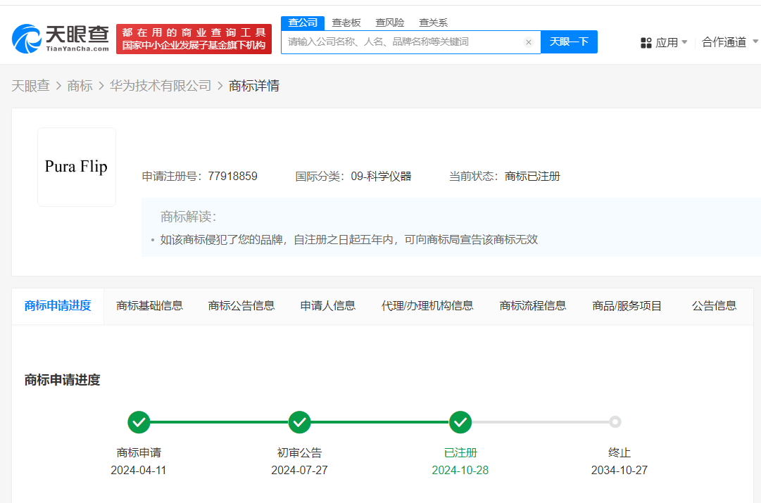天眼查知识产权信息显示,华为技术有限公司已申请注册“Pura”“Pura Fold”“Pura Flip”商标,国际分类包含运输贮藏、科学仪器、建筑修理等,目前部分商标已成功注册。