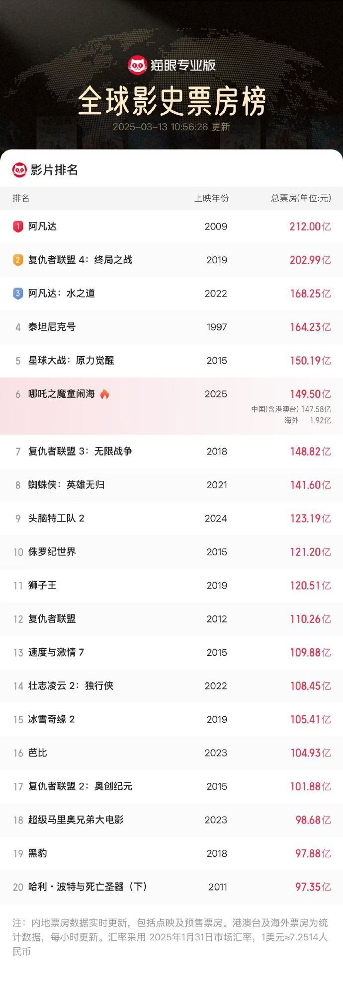 据猫眼专业版数据,截至3月13日10时,《哪吒之魔童闹海》全球票房(含预售及海外)已达149.5亿,距离150亿还差5000万。