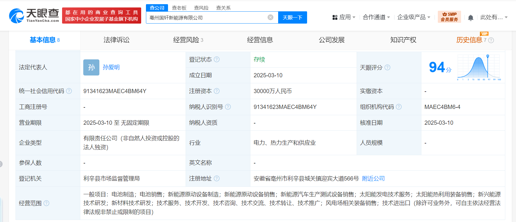 天眼查App显示,近日,亳州国轩新能源有限公司成立,法定代表人为孙爱明,注册资本3亿人民币,经营范围含电池制造、电池销售、新能源原动设备制造、新能源原动设备销售、新能源汽车生产测试设备销售、太阳能发电技术服务、太阳能热利用装备销售、新兴能源技术研发等。股权全景穿透图显示,该公司由合肥国轩高科动力能源有限公司全资持股,后者为国轩高科(002074)全资子公司。