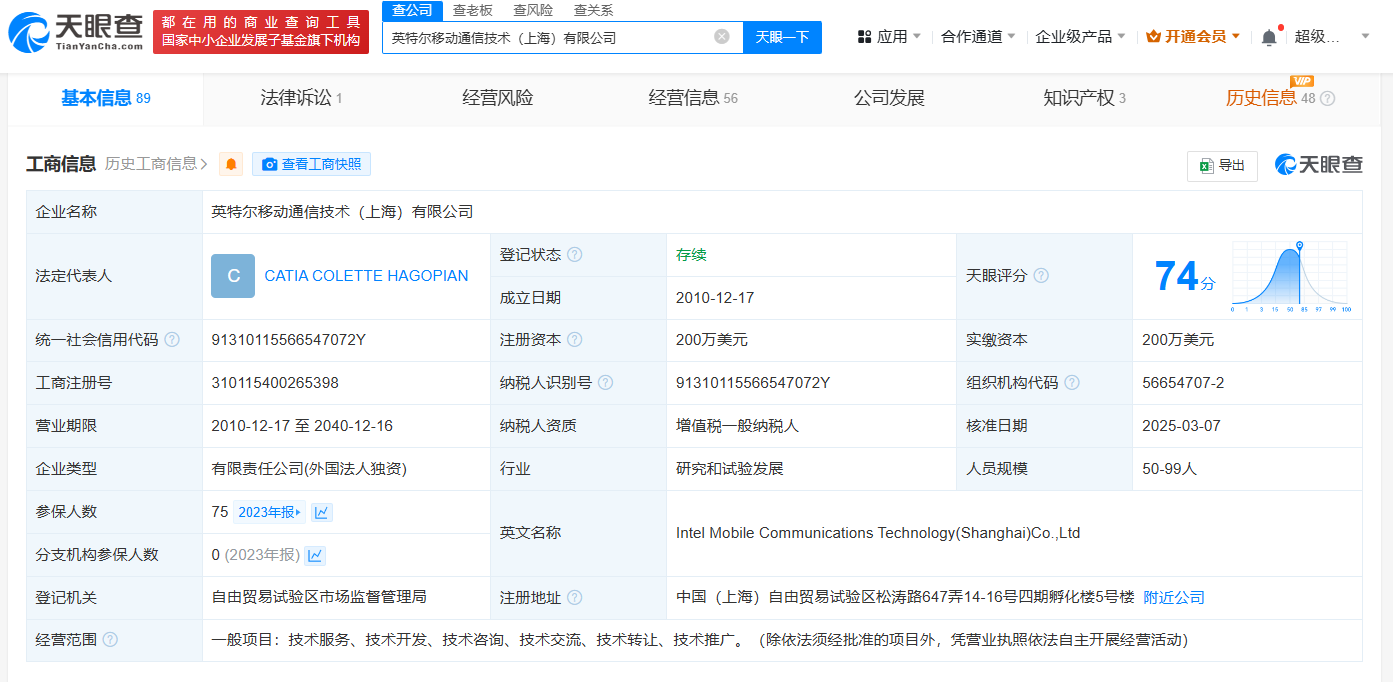 天眼查App显示,近日,英特尔移动通信技术(上海)有限公司发生工商变更,TIFFANY DOON SILVA卸任法定代表人、董事长,由CATIA COLETTE HAGOPIAN接任;同时,INTEL DEUTSCHLAND GMBH退出股东行列,新增ALTERA HOLDINGS CORP.全资持股。