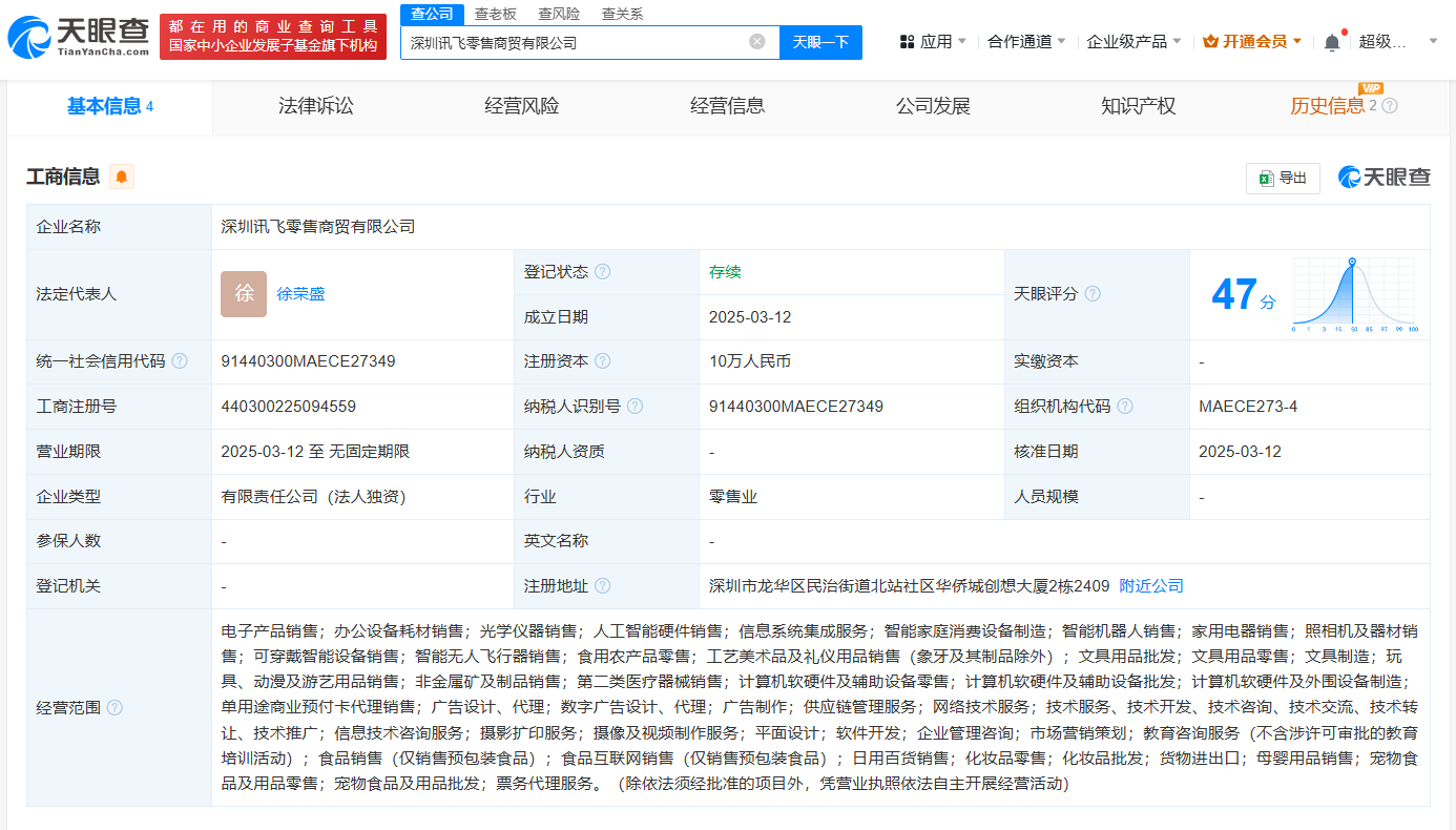 天眼查App显示,近日,深圳讯飞零售商贸有限公司成立,法定代表人为徐荣盛,注册资本10万人民币,经营范围包括电子产品销售、人工智能硬件销售、智能机器人销售、智能无人飞行器销售、供应链管理服务等。股东信息显示,该公司由科大讯飞(002230)旗下安徽讯飞新零售有限公司全资持股。
