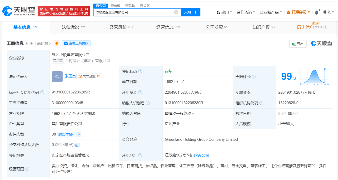 天眼风险信息显示,绿地控股集团有限公司现存18条被执行人信息,被执行总金额超50亿元,此外还存在多条股权冻结信息。