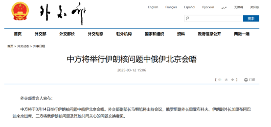 中方将于3月14日举行伊朗核问题中俄伊北京会晤。外交部副部长马朝旭将主持会议,俄罗斯副外长里亚布科夫、伊朗副外长加里布阿巴迪来京出席,三方将就伊朗核问题及其他共同关心的问题交换意见。