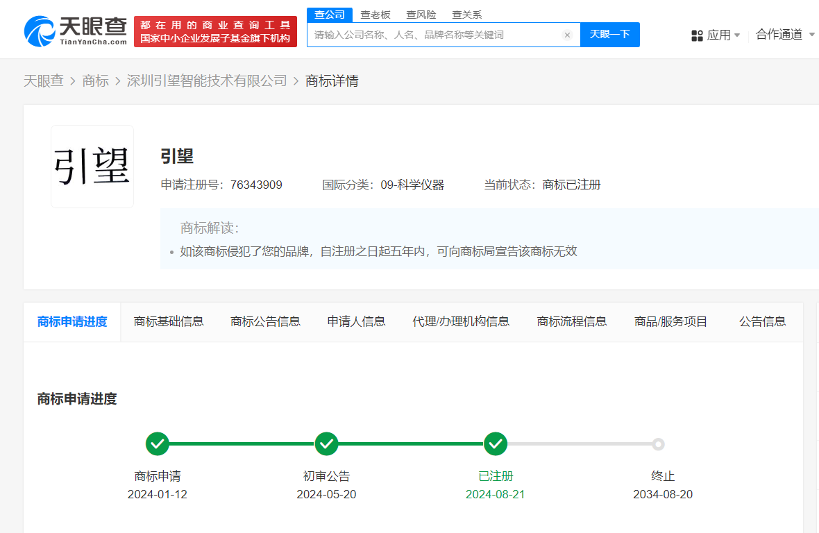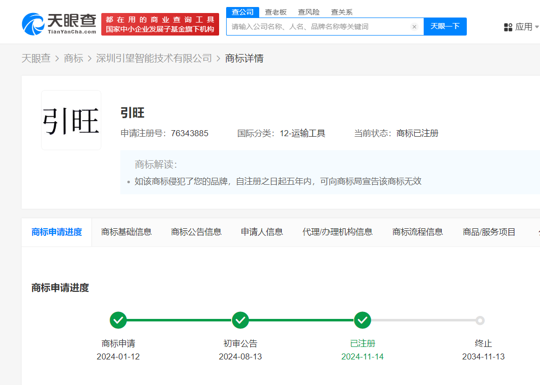 天眼查知识产权信息显示,近日,华为技术有限公司将多枚“引望”“引看”“引旺”“引众”“引见”“印望”“神观”等商标转让至深圳引望智能技术有限公司,国际分类为运输工具、科学仪器、网站服务等,上述商标申请于2020年至2024年,当前多数商标已成功注册。