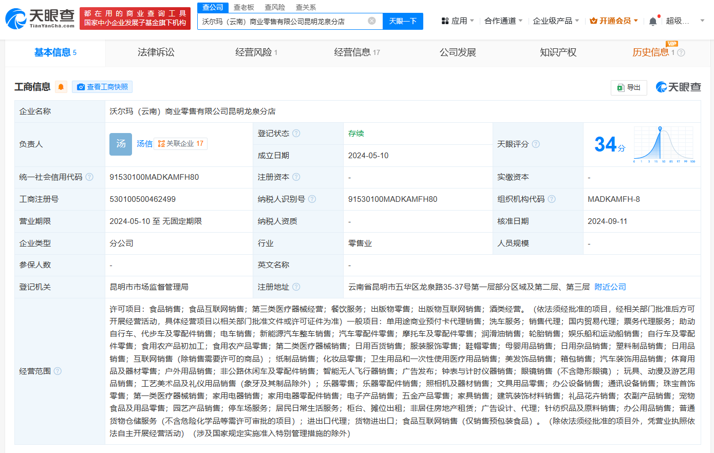 天眼查深度风险信息显示,近日,沃尔玛(云南)商业零售有限公司昆明龙泉分店经核查发现场所使用、营业情况与承诺内容不符,违反《中华人民共和国消防法》,被昆明市五华区消防救援大队责令停产停业并罚款4万元。