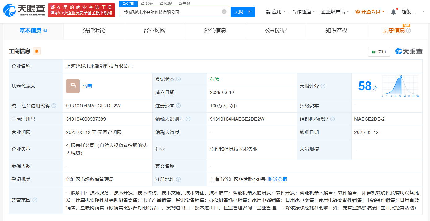 天眼查App显示,近日,上海超越未来智能科技有限公司成立,法定代表人为马啸,注册资本100万人民币,经营范围包括智能机器人的研发、软件开发、智能机器人销售、软件销售、计算机软硬件及辅助设备批发等。股东信息显示,该公司由安徽艾德未来智能科技有限公司全资持股。