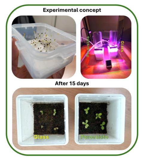 在本项研究中,论文共同通讯作者、意大利国家研究委员会-微电子与微系统研究所Alessandra Alberti和同事及合作者一起,设计出一个实验室规模、有一个半透明钙钛矿涂层屋顶的温室(有4个玻璃面板,每个2.5x2.5平方厘米),并对钙钛矿过滤光照下菊苣种子发芽和幼苗生长进行了15天的观察。他们发现,与在玻璃屋顶且无钙钛矿涂层的温室中生长的幼苗相比,钙钛矿涂层屋顶下的幼苗生长速度更快,叶片更大。