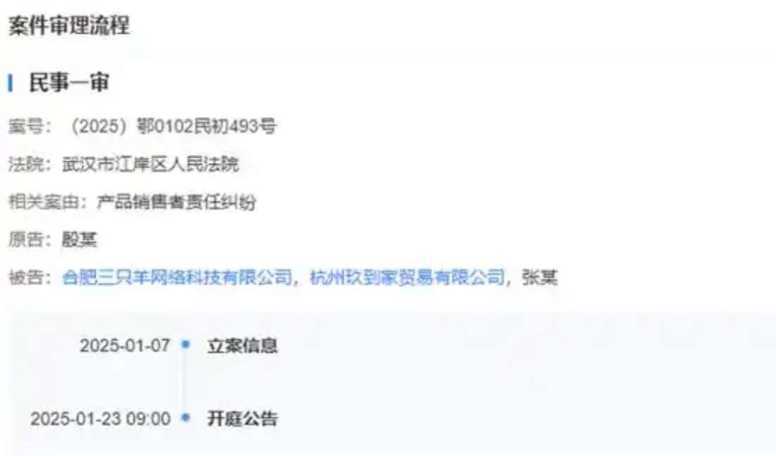 2月19日,玖到家又通过湖北省武汉市中级人民法院起诉了三只羊公司、张某、殷某,案由为产品销售者责任纠纷。