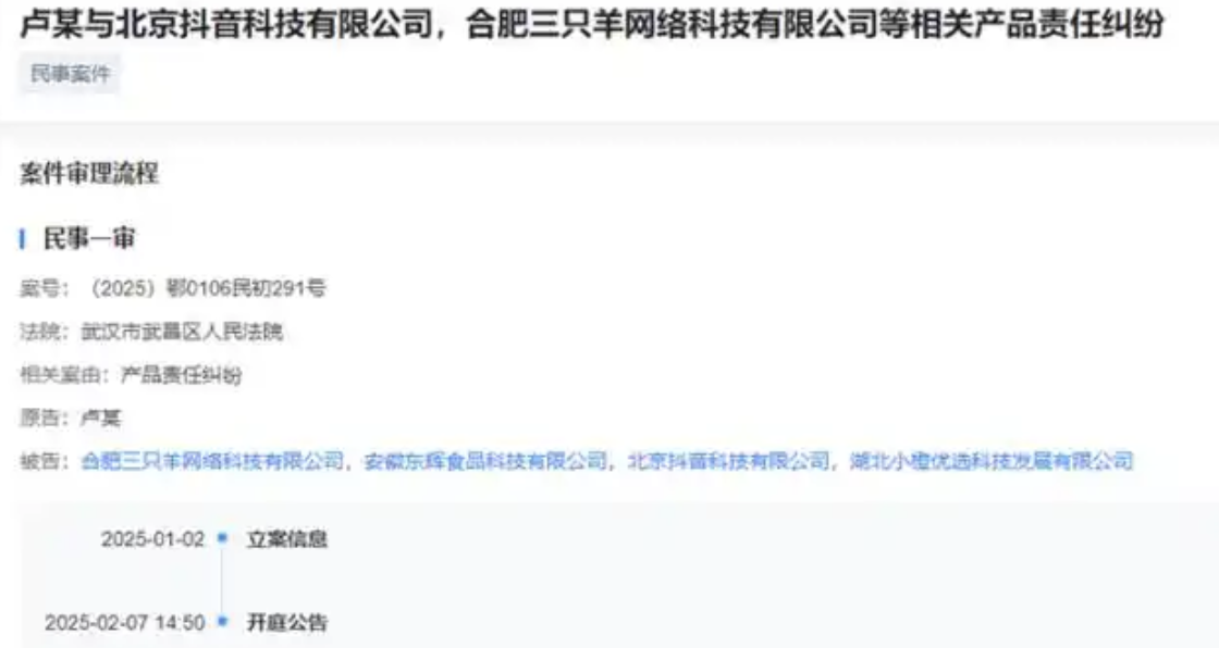 2025年1月2日,卢某起诉了三只羊公司、安徽东辉食品科技有限公司(以下简称“东辉食品”)、北京抖音科技有限公司、湖北小橙优选科技发展有限公司,案由是产品责任纠纷,该案于2月7日开庭。