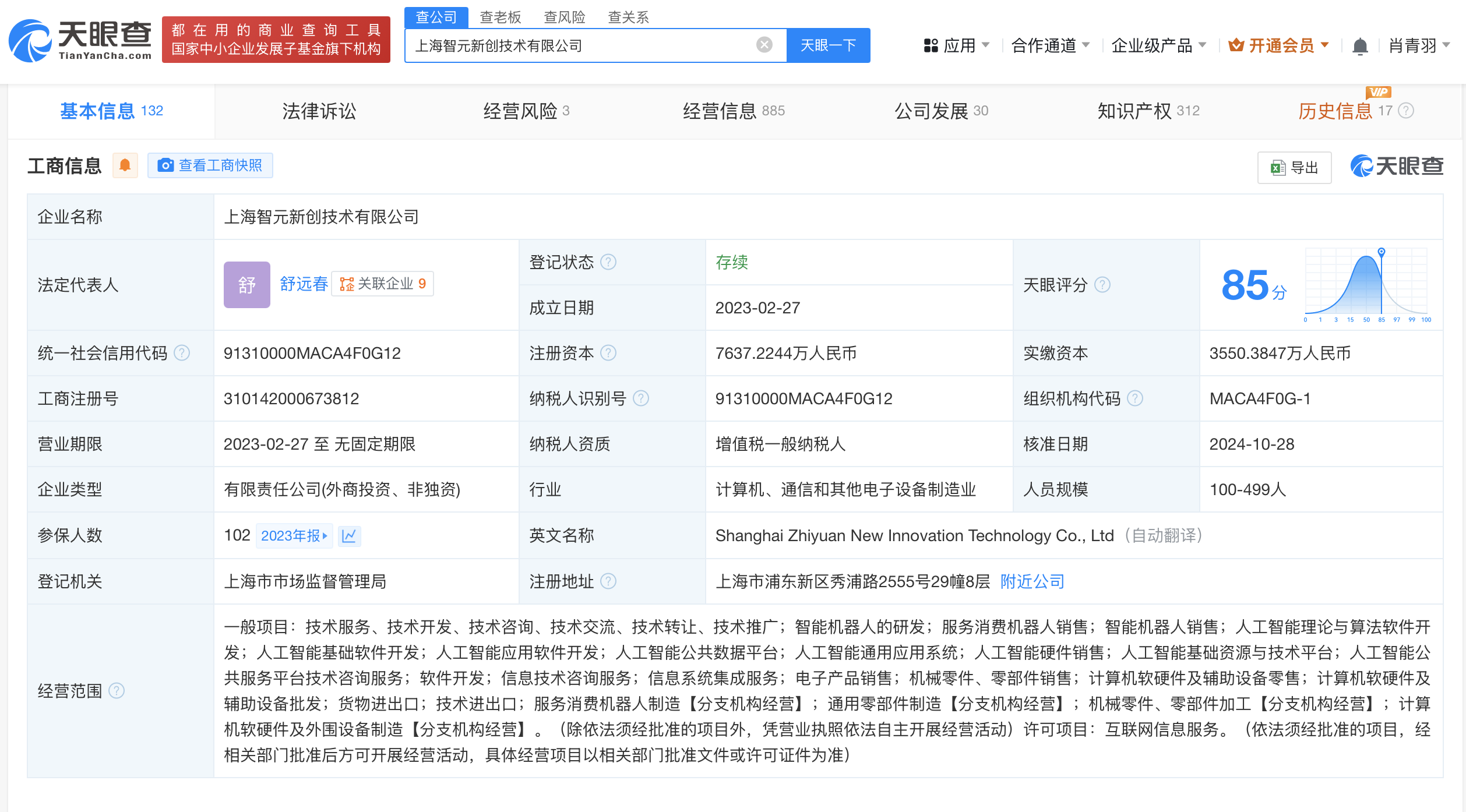 天眼查App显示,智元机器人关联公司上海智元新创技术有限公司成立于2023年2月,法定代表人为舒远春,注册资本约7637.2万人民币,经营范围包括智能机器人的研发、服务消费机器人销售、智能机器人销售、人工智能理论与算法软件开发、人工智能基础软件开发、人工智能应用软件开发、人工智能公共数据平台、人工智能通用应用系统等。股东信息显示,该公司由桑蓬(上海)科技合伙企业(有限合伙)、比亚迪(002594)、软通动力(301236)等共同持股。此外,彭志辉(稚晖君)通过桑蓬(上海)科技合伙企业(有限合伙)间接持股上海智元新创技术有限公司。
